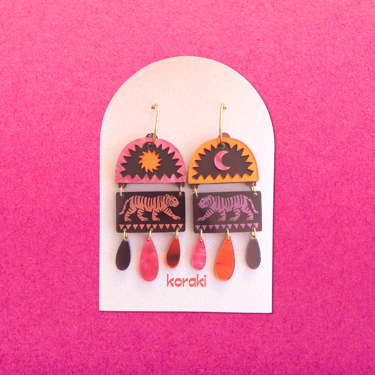 At Koraki, we create bold, colourful acrylic pieces for those who aren’t afraid to be seen. Every earring, necklace, and brooch is handmade and crafted to bring a fresh twist to your wardrobe.
