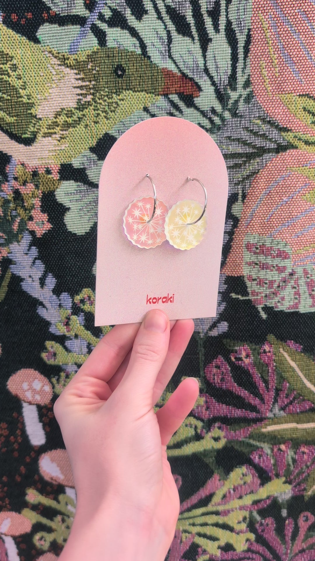 Light as air and full of shimmer. These iridescent dandelion earrings capture the dreamy moment a wish takes flight. Cut and etched from holographic acrylic that shimmers with every turn, they’re delicate, lightweight, and designed to catch the light (and maybe a few compliments). A perfect match to the Wandering Wish brooch, or a sweet little wish all on their own.